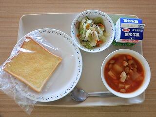 今日の給食は、食パン、チョコクリーム、牛乳、鶏肉のトマトソース、キャベツとコーンのサラダ、アルファベットパスタスープ、栃木県産生乳仕立てヨーグルトです。