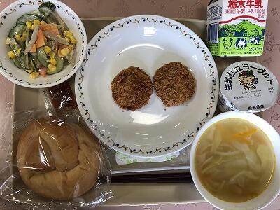 今日は、栃木市の「キャベツ」と栃木市産のお米の粉で作った「米粉パン」でしたひらめきパンは、お米を細かい粉にして、よく膨らむように小麦のグルテンを加えて作るそうです。小麦粉だけの通常のパンよりも、もちもちしているのが特徴ですキラキラ他にも、栃木市産 豚肉のとんかつもありました。衣がサクサクで、肉がやわらかく、かみ切りやすかったですね。サラダのごぼうや、ヨーグルトは、栃木県産です了解