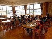 1年生にとっては初めての給食です。「ハンバーグ大好き!」「このお芋やわらかそう。」などと言いながら楽しそうに食べていました。