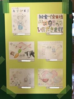 それから…給食に関するイラスト・メッセージの作品を1階談話コーナー前に掲示しています