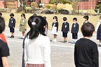 ↓↓ 入学式会場の体育館には、1年生とその保護者、そして在校生は6年生児童のみに制限しているので、2年生から5年生との対面でのご挨拶・・・「よろしくおねがいします!