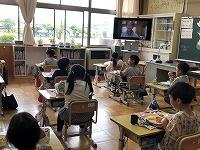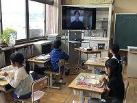 ↓↓ お一人ずつ自己紹介をしていただきました。子どもたちは給食を食べながら、大型テレビの画面に釘付けです