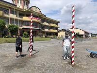 当初の予定では、今日天幕も張りたかったのですが、今週中頃にまた、雨の予報なので、まだ骨組だけにしておくことにしました。子どもたちは、連絡したとおり、トラックの中に入らず校庭の端の方や遊具で遊んでいてくれたので、安全に作業ができました