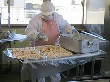 フライドチキンは、給食室で鶏肉に味付けをし、一つ一つ丁寧に手作りしています。
