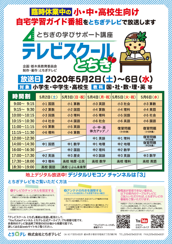 臨時休業中の小・中・高校生向けの自宅学習ガイド番組「テレビスクールとちぎ」が5/2(土)~5/6(水)に放送されます。詳しくは専用サイトをご覧ください。https://www.tochigi-tv-school.jp/