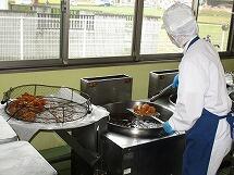鶏肉の唐揚げは、給食室で下味をつけ、片栗粉をまぶして一つ一つ丁寧に油で揚げています。みんな大好きで、小さく切り分けたおかわりには、おおぜいの子供達が集まっていました。