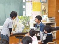 一生懸命読み聞かせをする図書委員の児童たち。