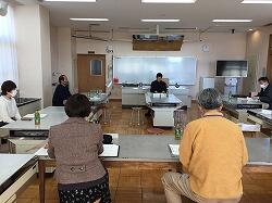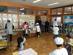 1・2年教室、ランチルームで給食の配膳の様子を見学いただき、試食会を実施しました。食事中は、どんな牛乳を飲んでいたかビン?三角?など、懐かしい給食エピソードで盛り上がりました。食事後、栄養教諭から給食指導について、食物アレルギー対応や献立作成の工夫等について説明がありました。