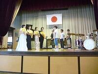 後半に体験コーナーがあり、代表の児童がマリンバやドラムスを体験し、校歌に合わせて演奏をしました。また、いろいろな楽器の説明もしていただき、楽しい時間となりました。
