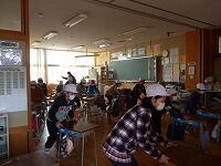 担任の先生が窓の鍵やカーテンを締め、子どもたちは机を壁の方に寄せて固め、シェルターを作りました。