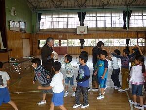 上級生のお兄さんお姉さんが、下級生に優しく跳び方を教えてくれています。