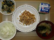 今日の給食のメニューは、「ごはん 牛乳 かつおのごま味噌和え 磯香あえ にら玉汁」でした。