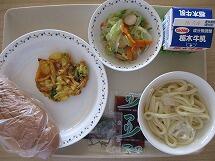 うどんは、炭水化物が豊富に含まれ、エネルギーのもとになります。消化のよい食べ物なので、カゼをひいて胃腸が弱っているときの食事としても最適です。今日は冷やしうどんです。めんつゆをかけて、きざみのりをふりかけて食べて下さい。