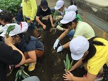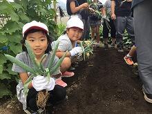 子どもたちは、優しい高校生の皆さんが教えてくれる中、地域の特産物である“宮ねぎ”の栽培ができることに大喜び