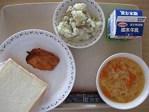 今日の給食のメニューは、「食パン・チョコクリーム 牛乳 タンドリーチキン ジャーマンポテト トマトと卵のスープ」でした。