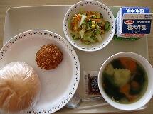 今日の給食のメニューは、「丸パン 牛乳 ハンバーグトマトソース 海藻サラダ コーンチャウダー」でした。