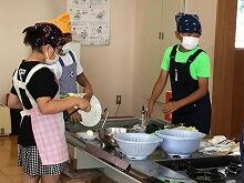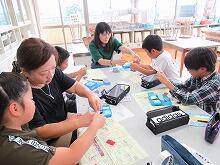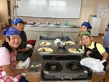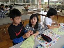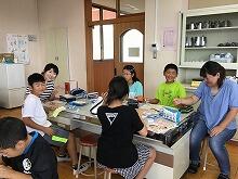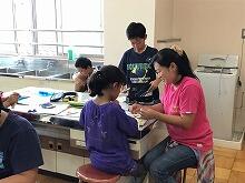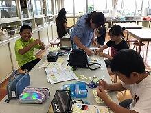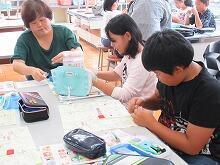 裁縫ではボランティアの皆様に御協力頂き、玉留め・玉結び・並縫いや本返し縫い・ボタン付け等を学習しました。初めての裁縫でしたがボランティアの方々が丁寧に教えてくださったので、2時間ほどでとても上手になりました。2学期にはフエルトを使った小物作りに挑戦します。