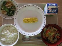 今日の給食のメニューは、「ごはん 牛乳 中華丼の具 彩り野菜の玉子焼き 姫きゅうりともやしのキムチあえ」でした。
