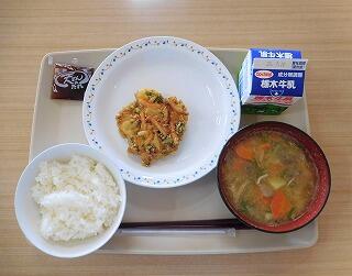 今日の献立は、ごはん、牛乳、豚肉のスタミナ焼き、生揚げときぬさやの味噌汁です。