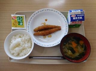 今日の献立は、ごはん、ひじきふりかけ、牛乳、ししゃもフライ・ソース、キャベツのみそ汁です。