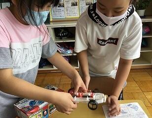 自分で作った車で、風やゴムの実験。わくわくしましたね