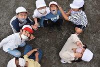 ↓↓ 放送の合図で、子どもたちがカラーエプロンを着て、校庭に出てきました。