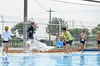 おかげさまで、雷雨は少し遠ざかってくれたようで、清掃も完了し、きれいで清潔な水泳環境が整いました。作業で使った清掃用具の水が切れたので、片付けまで終了!来週から、いよいよ水泳学習が始められますね笑う