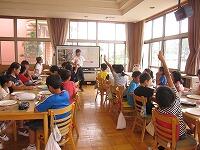 ↑ イラストを使って、実際にバイキング体験をしたあと、食事は「主食」「主菜」「副菜」をバランス良くとることが大切であることを教えてもらいました