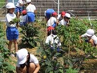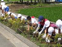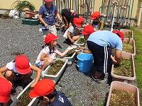 6月22日ロング昼休みの時間に、全校で草むしりや花壇の手入れを行いました。分担場所は、1年・教室前花壇、2年・野菜畑、3年・宮ネギ畑、4年・花壇、5年・北門通路花壇、6年・バックネット裏芝生、美化委員・プランター土入れです。とても暑い中、みんな頑張りました。