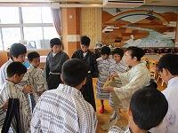 6年生の総合の時間で「着付け体験」を行いました。講師の先生を招いて、浴衣の着方、お辞儀や座り方のマナーについて学びました。一人一着浴衣を用意してくださり、浴衣のたたみ方、帯の結び方などを丁寧に教えていただきました。男の子も女の子も多くの子が初めての浴衣に喜んでいました。