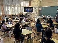 ↓↓ 各教室では、大型TVをしっかり見つめて話を聞き、話が終わると「よろしくお願いします」とあいさつをして拍手を贈る千塚小の子どもたちです