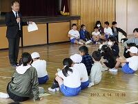 4月14日、業間の時間に朝会を行いました。校長先生のお話は、児童の異年齢集団ワールドグループを活動させるもの。グループごとに千塚小の自慢ベスト3を考えたり、グループの1年生を全体の前で紹介できるように1年生に質問をしたりしました。最後には6年生が、1年生全員の紹介を行いました。写真を見ても昨日より、相談時のメンバー相互の距離が近いのがわかります。