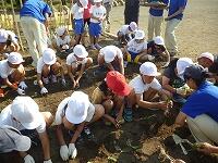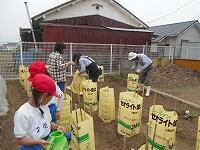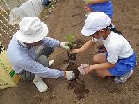 5月9日、地域の野菜作り名人の方に教えて頂き、畑に野菜の苗を植えました。ナスやピーマン、オクラ、スイカ、サツマなどの苗を、ポットの出し方から植え方、水やりの仕方まで丁寧に教えて頂きました。また、キュウリの苗や棚を作って頂いたり、苗を寒さや乾燥から守りしっかり根が付くように袋で覆いをしたりして頂きました。ボランティアのお母さん方にもお手伝い頂きありがとうございました。