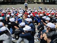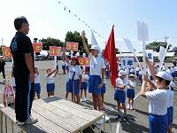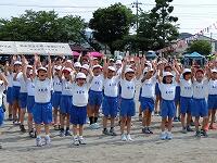 5月8日、運動会練習が始まりました。業間の時間に、紅白に分かれての整列、服装、脱帽・着帽、回れ右など基本的なことを確認し、ラジオ体操第一をやりました。