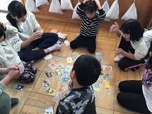 グループ毎に、カルタ、トランプ、すごろく、だるま落とし、けん玉、おはじき、ビー玉の中から遊びたい物を2つ選び、仲良く遊ぶことができました。