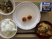 今日の給食のメニューは、「ごはん 牛乳 厚揚げの麻婆炒め 揚げエビしゅうまい にらの中華あえ」でした。