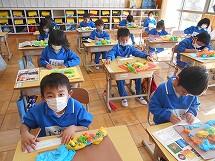3学期が始まり、1年生はみんな元気に登校しています。図工の時間にお花紙(様々な色の薄い紙)で好きな形を作りました。