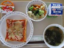 今日の給食のメニューは、「ピザトースト 牛乳 ブロッコリーとカリフラワーのサラダ わかめととうもろこしのスープ アセロラゼリー」でした。
