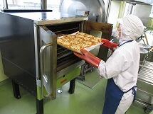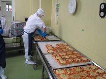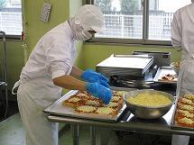 ピザトーストは、サラミソーセージや、たまねぎ、ピーマンなどを炒め、ピザソースを作って食パンにぬり、とけるチーズを上からかけて、調理員さんが一枚一枚ていねいにオーブンで焼いて作っています。残さず食べて下さい。