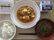 今日の給食のメニューは、「ごはん 牛乳 鶏肉の七味焼き 豆腐のサラダ のっぺい汁」でした。