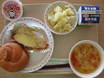 今日の給食のメニューは、「巨峰の米粉パン 牛乳 鮭のチーズマヨネーズ焼き 粉ふきいも 栃木市産トマトのスープ とち介いちごゼリー」でした。