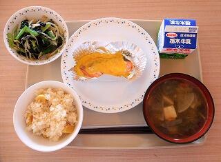 今日の給食は、栗ご飯、牛乳、鮭のもみじ焼、磯香和え、けんちん汁です。