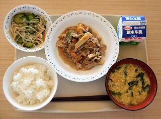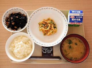 今日の給食は、ごはん、牛乳、焼き鳥風煮、わかめとキャベツの酢の物、じゃがいものみそ汁です。