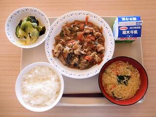 今日の給食は、ごはん、牛乳、なすとピーマンの鍋しぎ、きゅうりとわかめの酢の物、かきたま汁です。