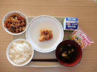 今日の給食は、ごはん、ちらしずしの具、牛乳、鶏肉のからあげ、はまぐりのすまし汁です。