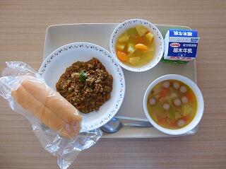 今日の給食は、背割りコッペパン、ドライカレー、牛乳、Winnerスープ、マスカットのジュレポンチです。