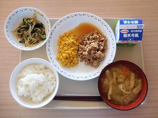 今日の給食は、ごはん、三色丼の具、牛乳、白菜と油揚げのみそ汁です。
