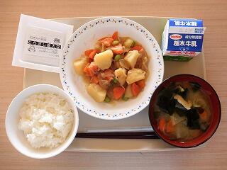 今日の給食は、ごはん、牛乳、肉じゃが、市産麦納豆、大根とわかめのみそ汁です。