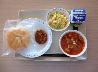 今日の給食は、丸パンスライス、牛乳、メンチカツ・ソース、コールスローサラダ、ミネストローネです。