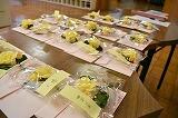第二部では各グループに分かれて、放送で校長先生のお話を聞き、6年生の似顔絵入り写真立て・メッセージ入り下敷き・お花をプレゼントしました。